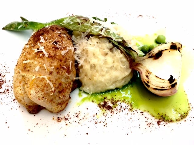 The main course, this lovely composition of risotto, quail stuffed with sausage, ramps, and peas....