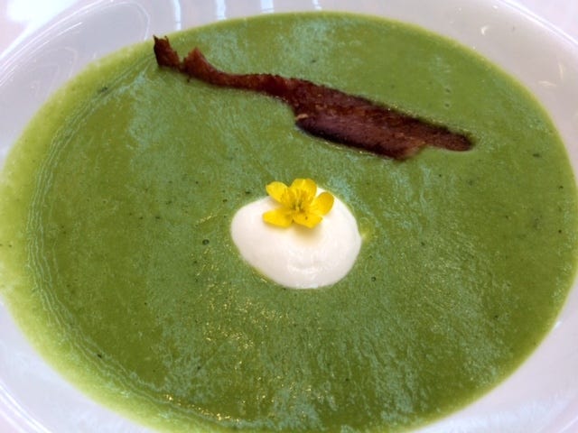 and a sprightly pea soup with bee balm and smoked herring.