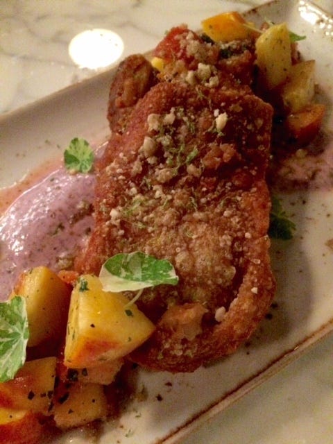 The evening ended with those fried pig tails at the top. Crisp and succulent, the sweetness of the peaches framed the natural richness of the pork.