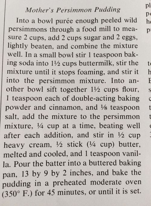 American wild persimmons are smaller than the hachiyas you find in the market right now, but I’m sure any persimmon will work in this recipe. Marion Cunningham always sent me a persimmon pudding as a Christmas present, so this brought back a lot of memories. (This recipe, baked rather than steamed in a water bath, seems more like cake than pudding. Which is, in my opinion, another good reason to try it.)