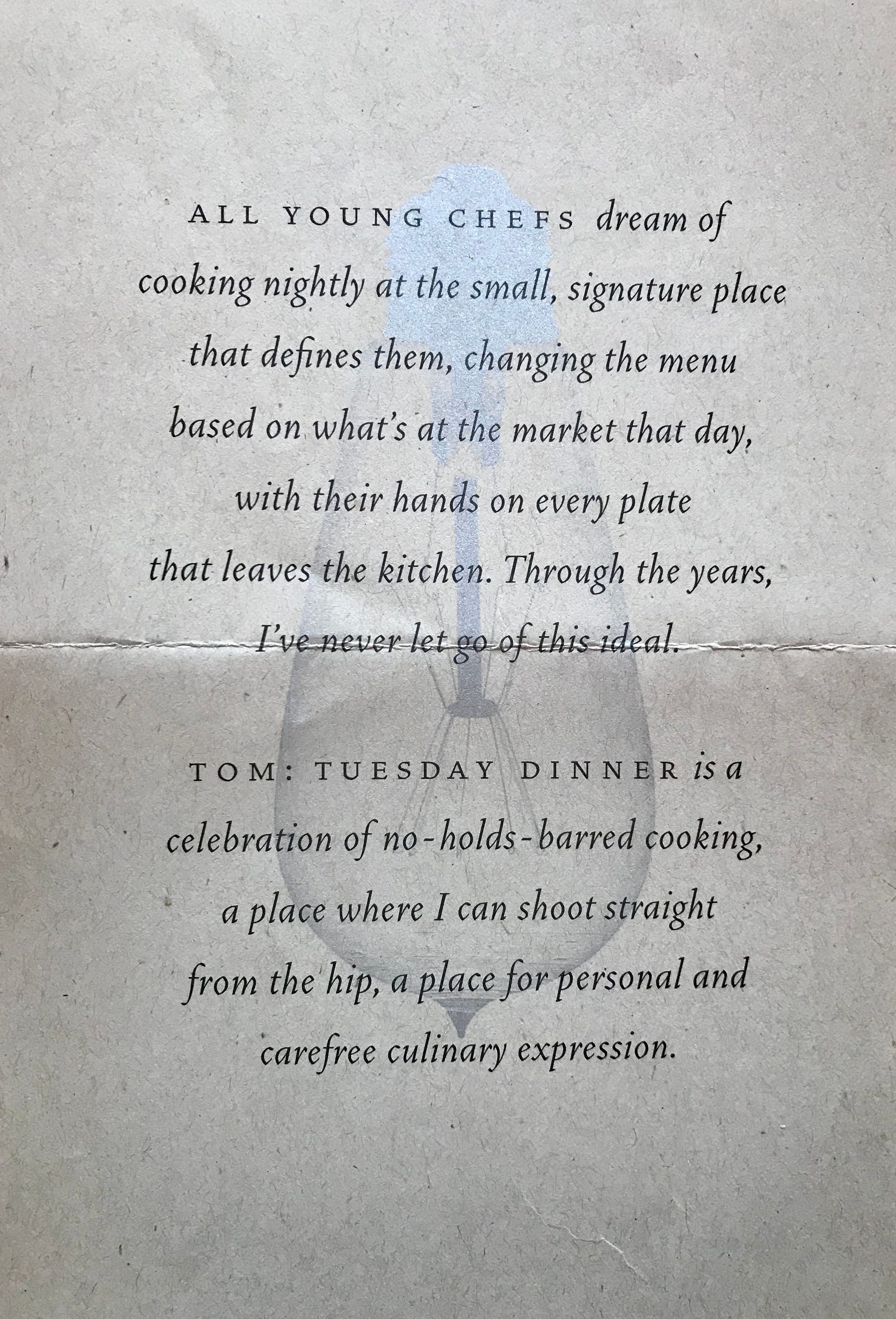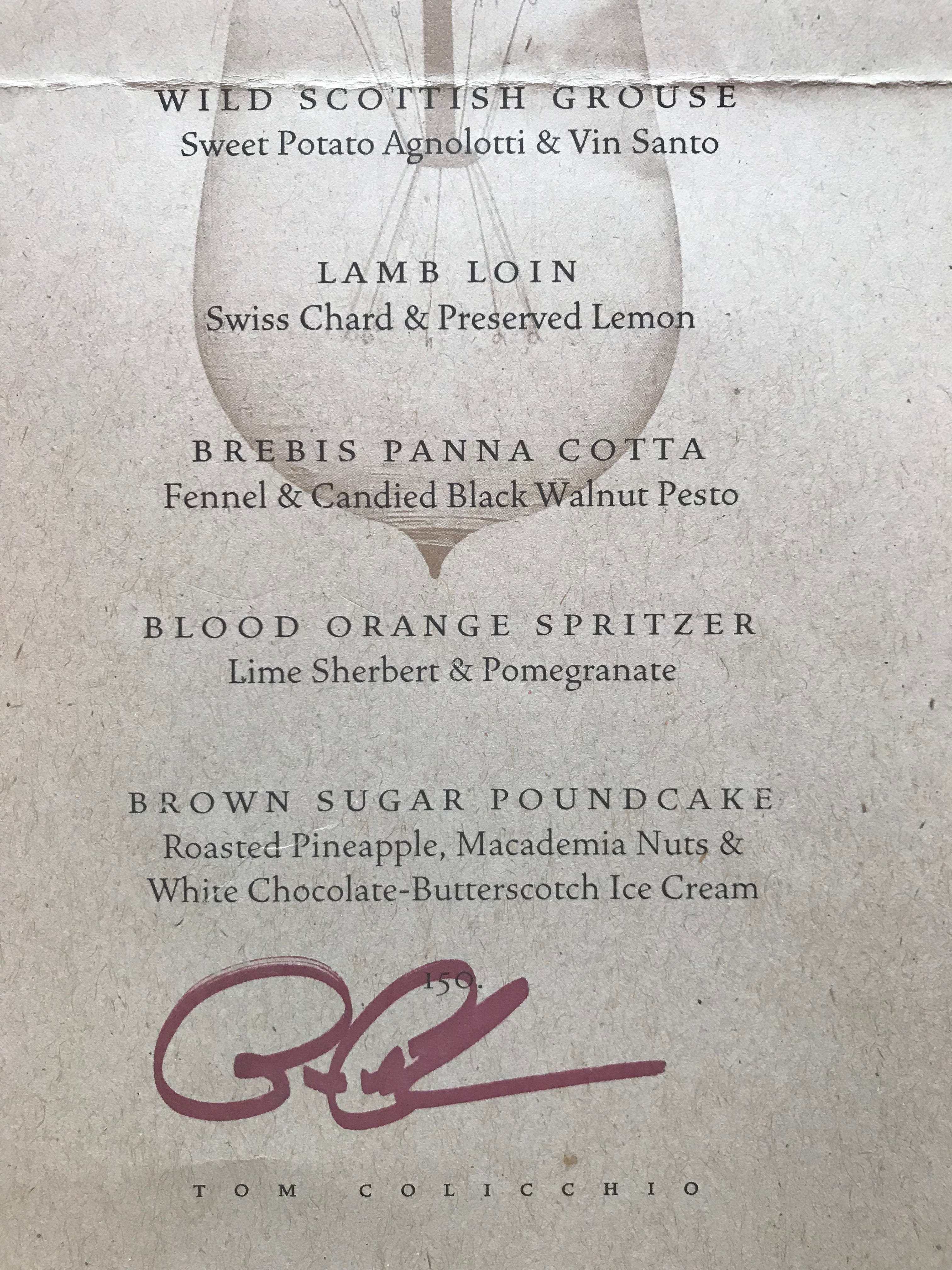 I’ve been invited to a party celebrating Craft’s 25th anniversary next Monday. Thinking about that milestone made me nostalgic for my favorite of Tom Colicchio’s enterprises, Tom’s Tuesday Dinners. They were always a thrill. I remember this particular one with great fondness. That grouse!