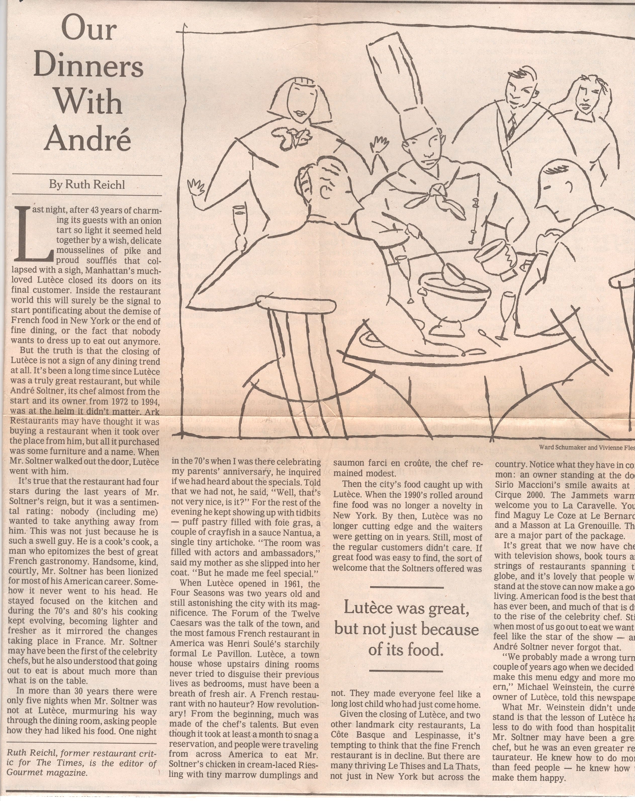 In 2004, when Lutece ended its long run, the New York Times asked me to write an op-ed piece about the restaurant. I ended up focusing on its remarkable owner/chefAndre Soltner. He was the soul of hospitality.