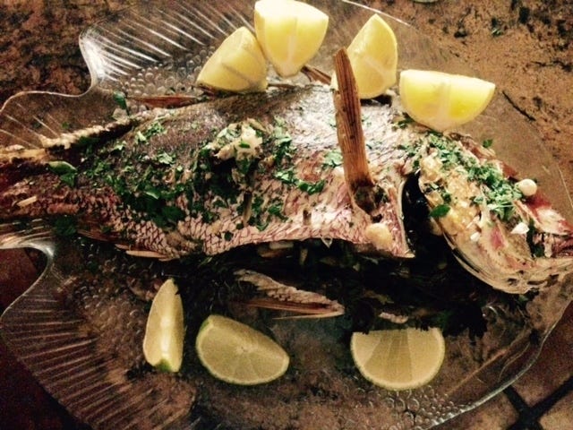 The aroma of wine and herbs mingled with the scent of the sea as the fish cooked in the oven. It was the most enticing smell. When I checked the temperature (the fish was about 3 and a half pounds), it was 135 at the thickest part behind the head. I let it rest for ten minutes, then sprinkled it with lime juice and took it to the table.