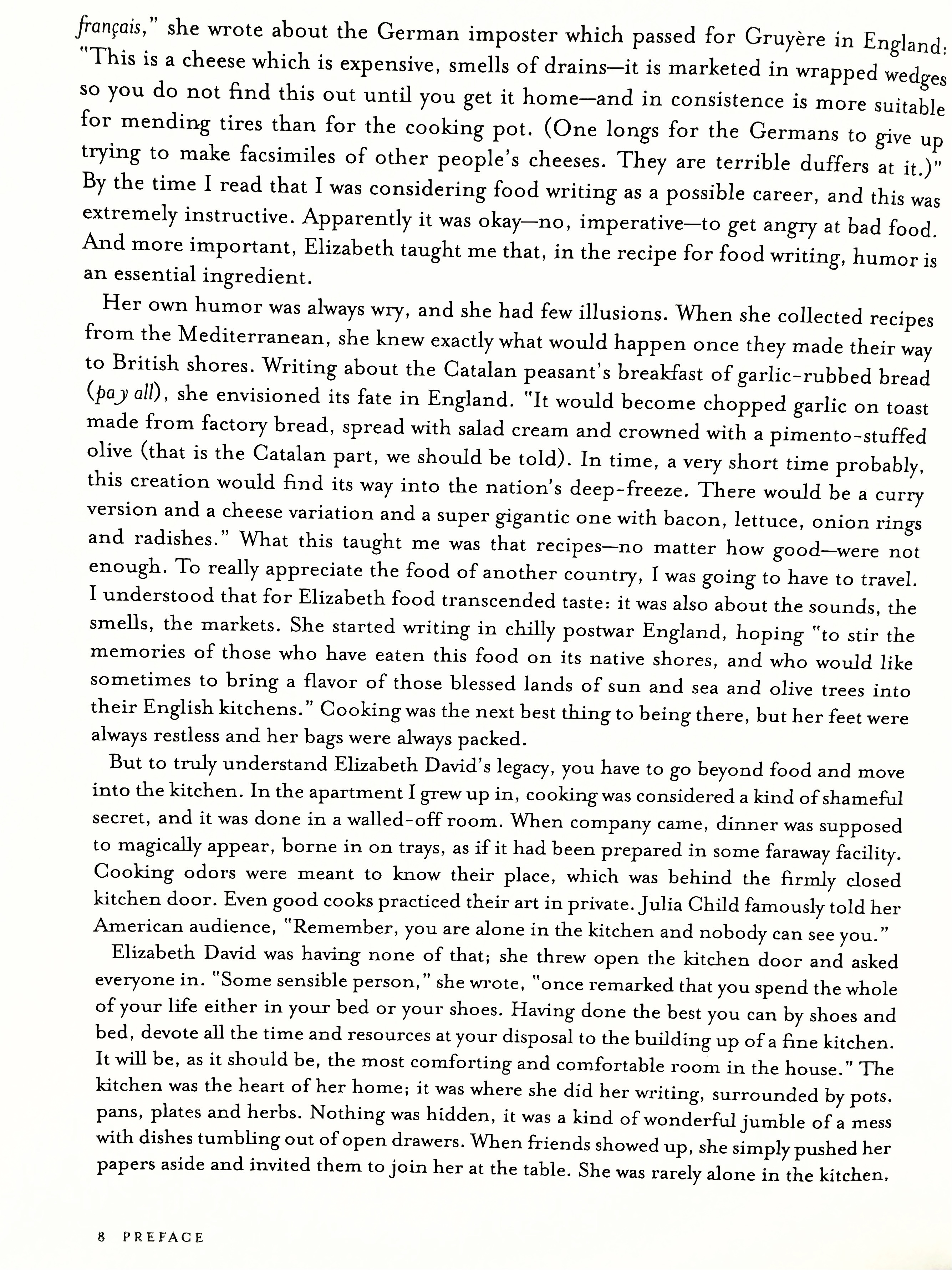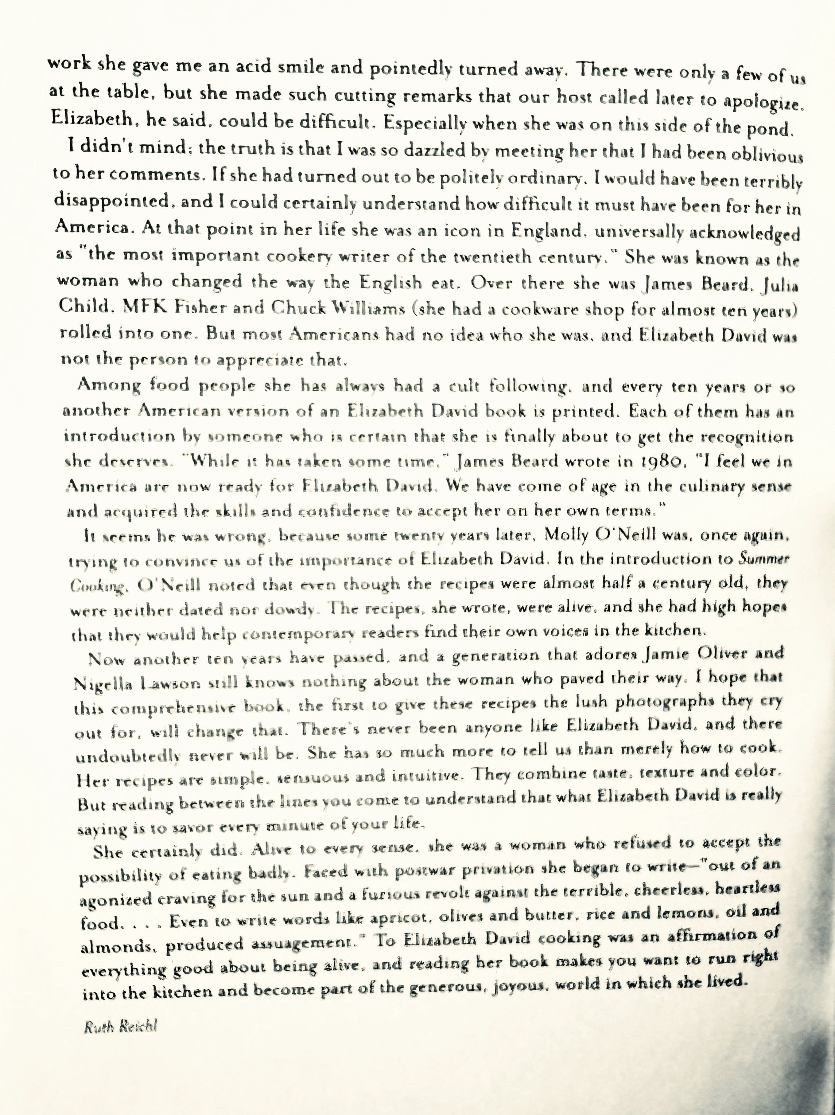 It makes me sad that Elizabeth David is not better known in this country, so I was thrilled 15 years ago when Dan Halpern of Ecco Press asked me to write the introduction to At Elizabeth David’s Table; like many ardent fans before me, I was hoping this would be the book that finally made Americans pay attention to the woman who was for England, Julia Child, MFK Fisher and Chuck Williams rolled into one. (By this I mean she was an inspirational cooking teacher, a great writer and the proprietor of a revolutionary cookware shop.)