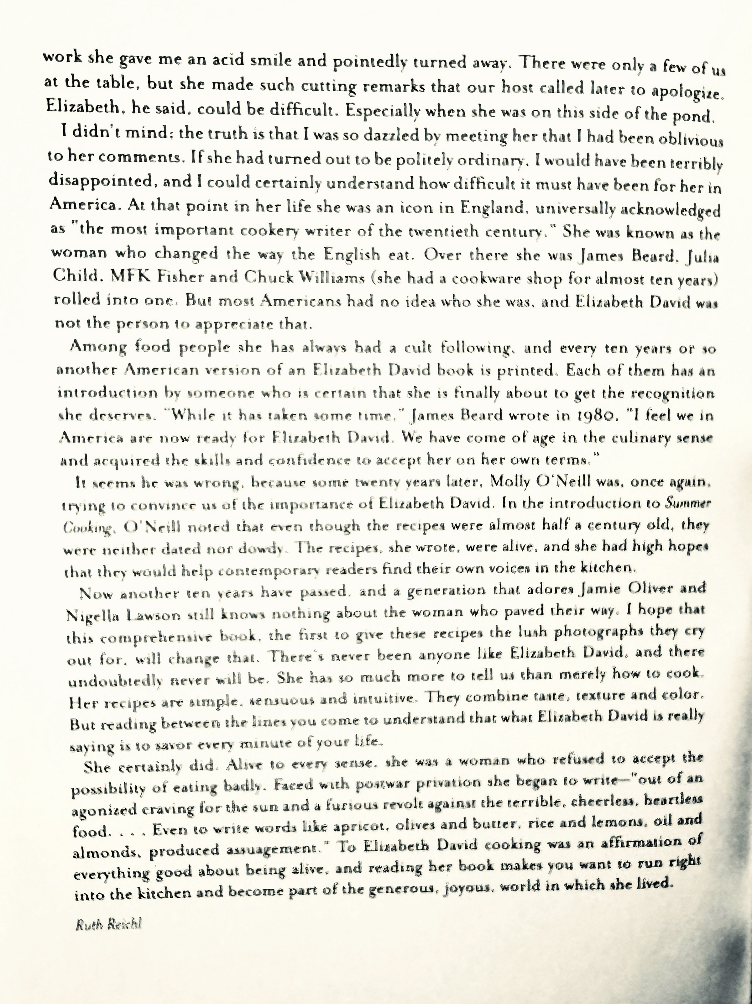 Thank you, Ruth. You’ve, once again, hit a tender spot. Elizabeth David is but one of many reasons why, at age 85, I'm unwilling to whittle down my treasured tomes. My library, incidentally, includes five (maybe more) Reichl titles, beginning with your 1972 "....mmmmm A Feastiary." My brain exercise comes not with Sudoku puzzles in Assisted Living who-knows-where, but by triggering strong memories the mere sight of each cover evokes. These covers bind not merely recipes (many with kitchen stains and marginal notes) but memories of how, why, when and where I acquired the book. Just yesterday, I opened the first cookbook I ever knew: leatherette-covered 1936 Household Searchlight Recipe Book with its unique twenty-size tabs. It fell open to page 185 where "Seven-Minute Icing" carried me back to our Iowa farm kitchen where I could hear the sounds when bent blades of Mom's "eggbeater" (with its chipped red-painted handle), hit metal sides of our dented Wear-Ever aluminum double boiler acquired at a traveling salesman's demonstration supper. She and I took turns licking the blades after we frosted the still-warm devil's food cake. Then I yelled “supper’s ready” to call my dad and four brothers to join us at the kitchen table.