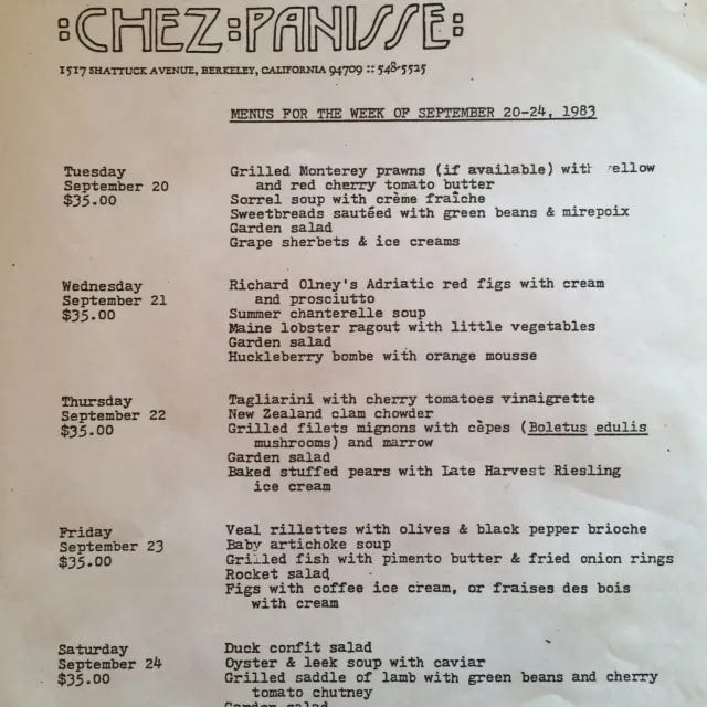 Chez Panisse has always been an Elizabeth David kind of place. I think she would have loved every one of these menus from 1983 - as well as the menus Alice Waters was serving 33 years later.