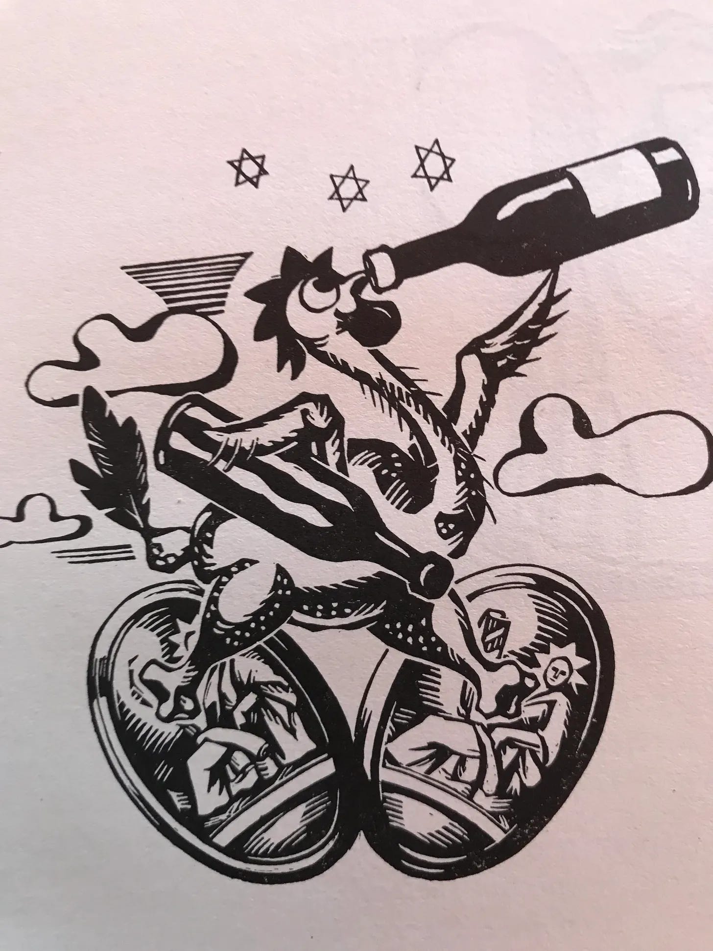 This is an image from his Vingt Plats qui Donnent La Goutte, an odd little book about twenty great French dishes. The dishes… bouillabaisse, cassoulet, veal kidneys, eel stew, quiche, a fat carp cooked in the oven…. are great - but the illustrations are even better. This one is, of course, coq au vin.