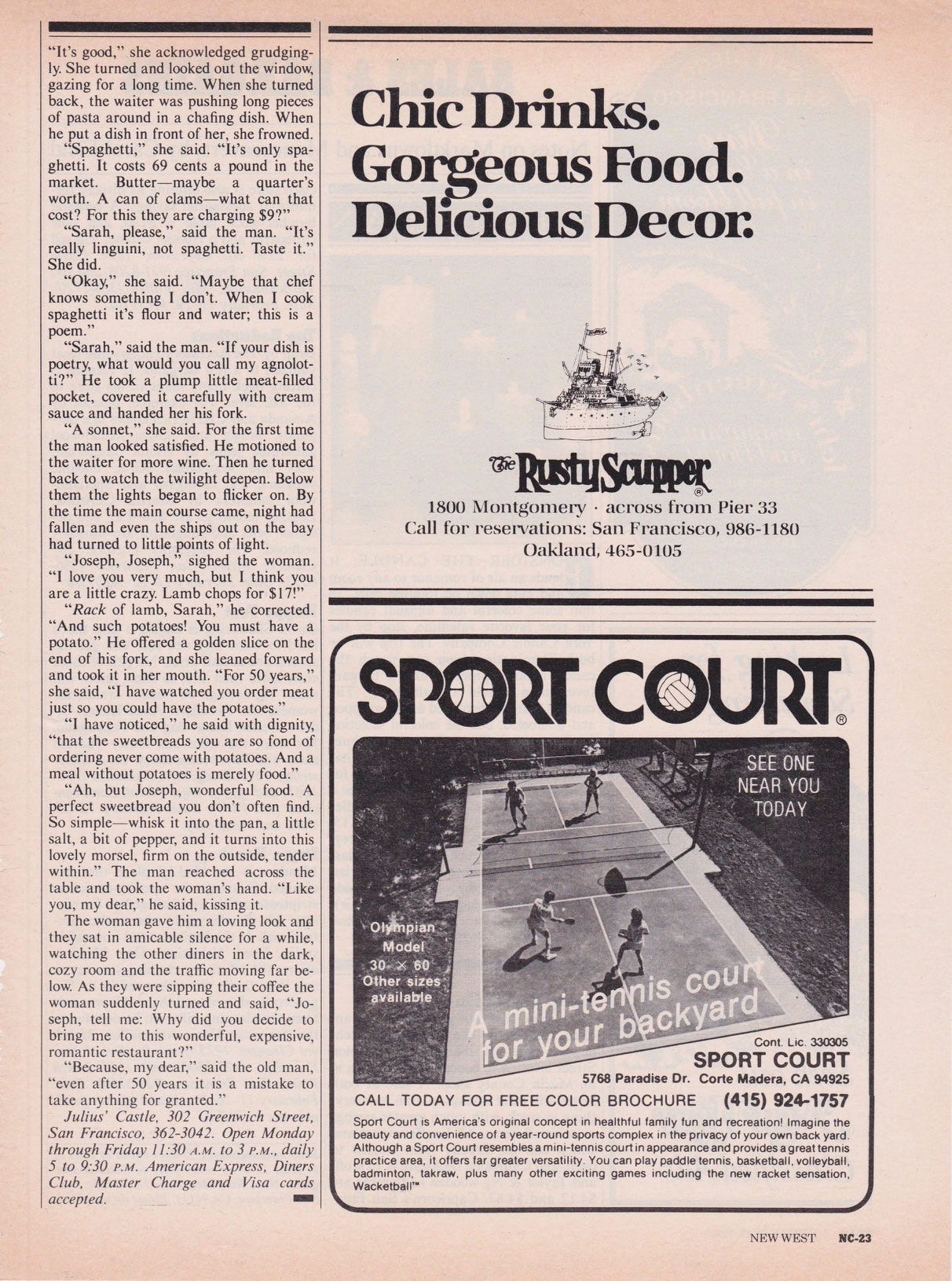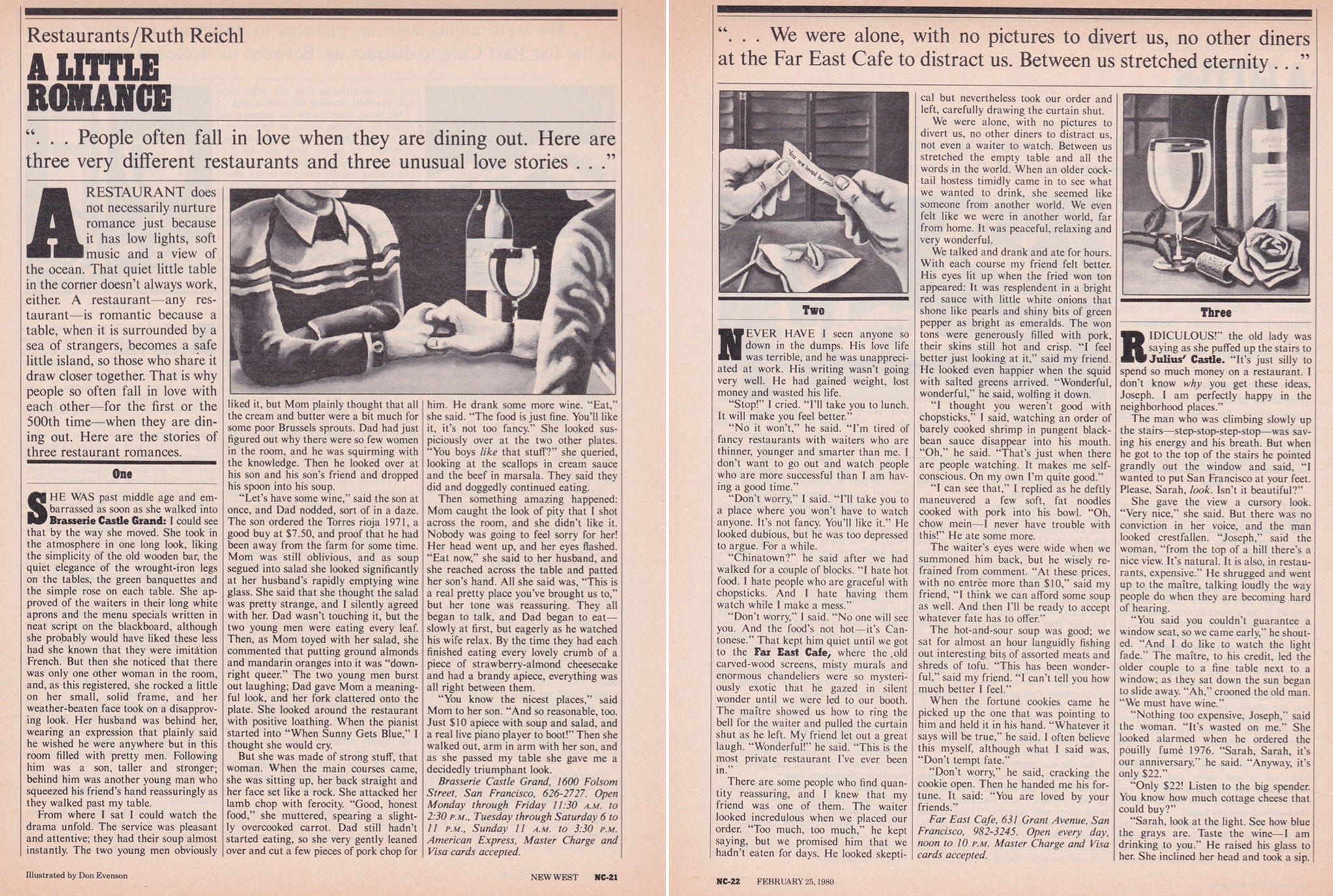 This early review from New West has always been one of my favorites. I especially like the last little vignette: I gave my parents pseudonyms, but they were with me when I ate at Julius’ Castle.