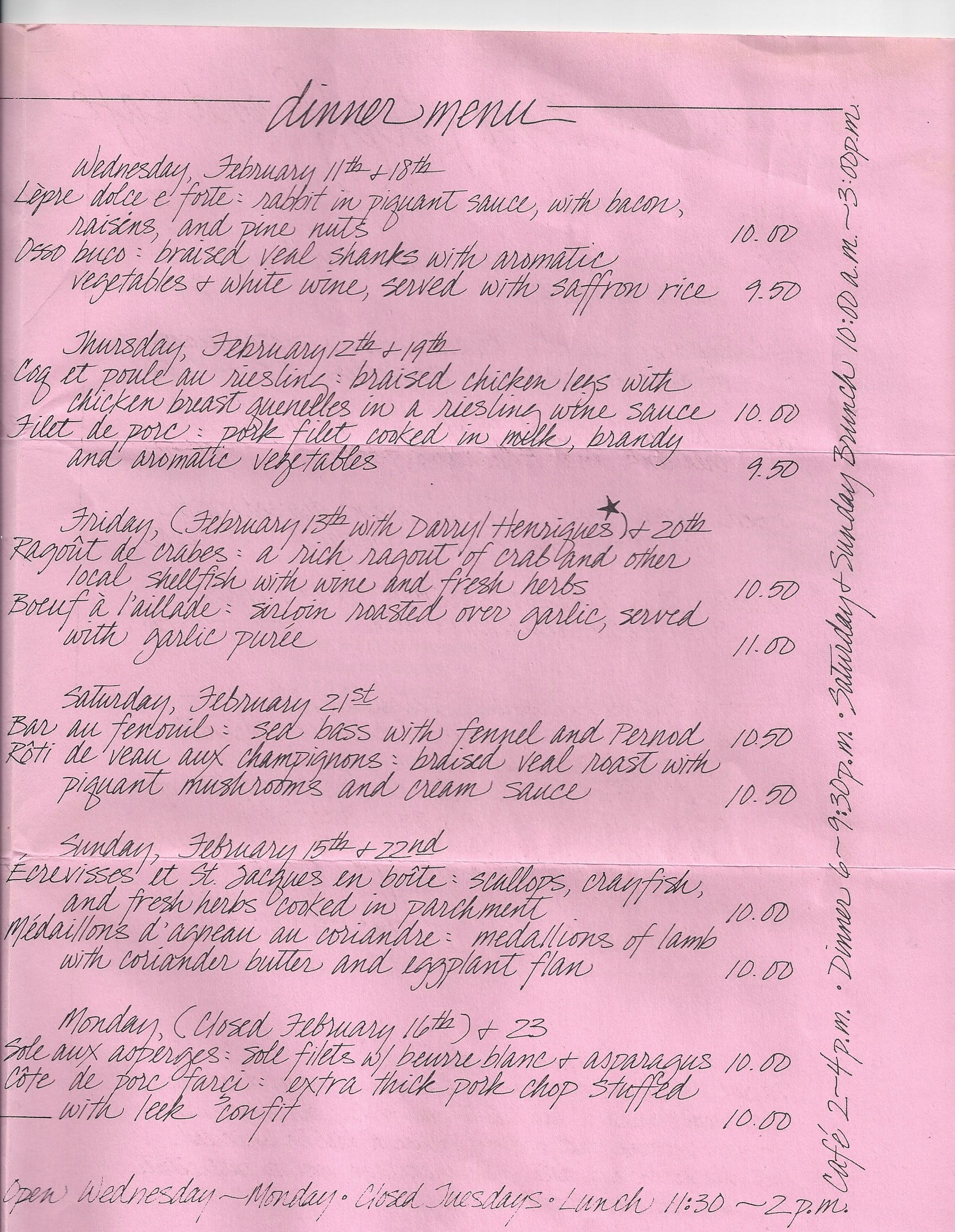 But the reason I wanted to share this menu - other than that it dates from around the same time as the review above - is the little note about Darryl Henriques being guest maitre d’ on Valentine’s Day. The actor and comedian, who had worked at the Cheese Board Collective was incredibly funny. Wish I’d been there!