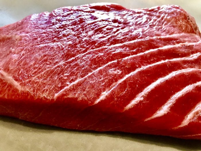 The offerings vary with the seasons, but sometimes, if you're very lucky, they have the gorgeous tuna in the picture above. Unlike some of the other offerings (learning to cut the hamachi filets takes a bit of work), the tuna is so lush that slicing it into sashimi could not be easier.