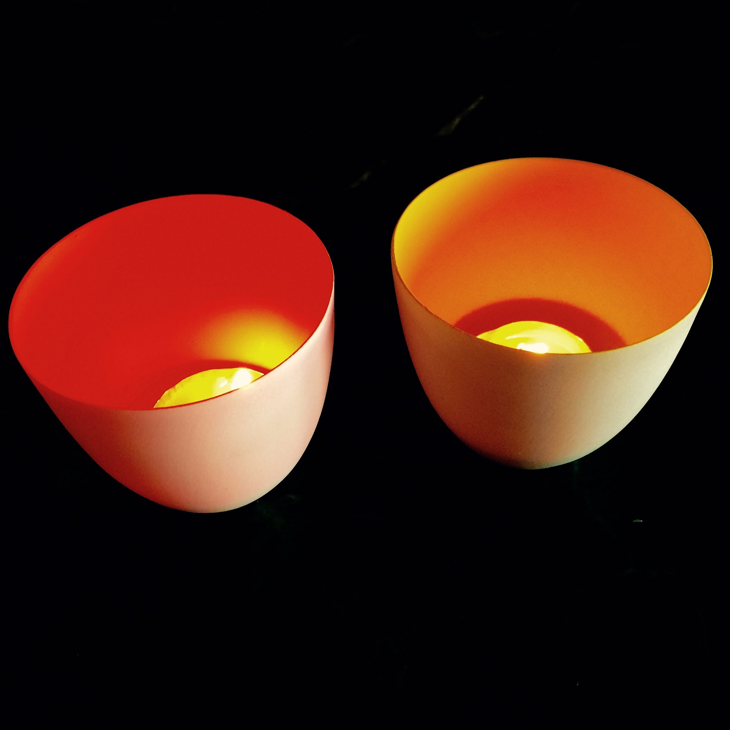 In the daytime these little tea lights don't look like much: tiny pale porcelain cups lined in neon colors.