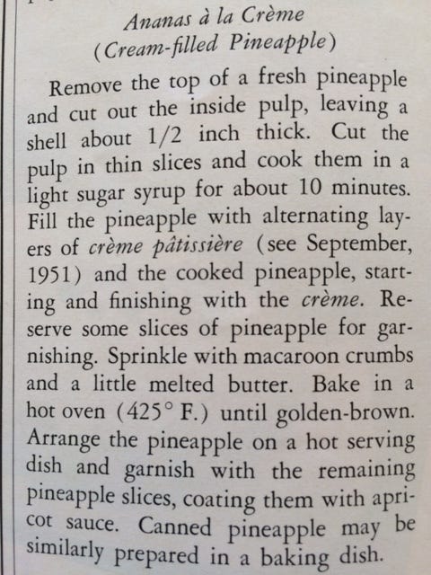 Leafing through this issue of Gourmet from 1951, I found still more proof that pineapples were all the rage. Here, just in time to grace your Easter table, is an old recipe for a cream-filled baked pineapple that must have looked quite spectacular.