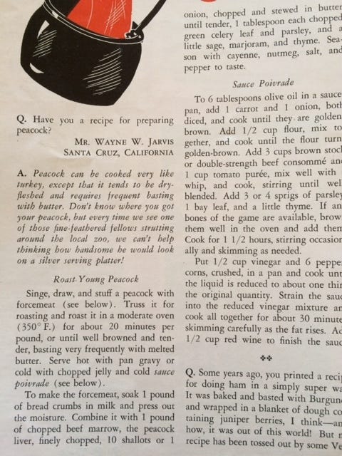 And then, of course, there's that old favorite, roast peacock. I wonder where they bought them.