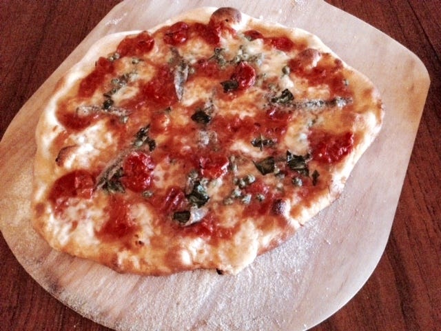 Finally, I hit on this recipe, which begins with a very soft dough that you gradually knead more flour into. It's very pliable, and gives you a pleasingly thin crust. I believe that our pizza tastes depend upon where we grew up - we all want the pizza of our childhood - but this is as close as I can come to the pizza of my dreams.