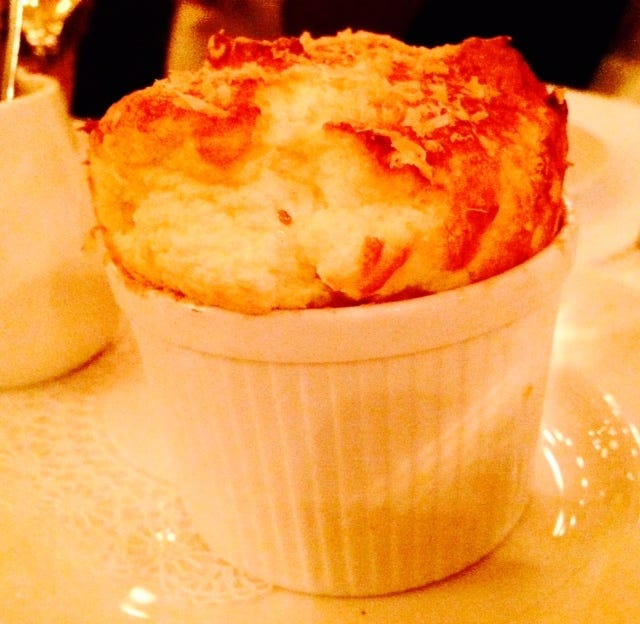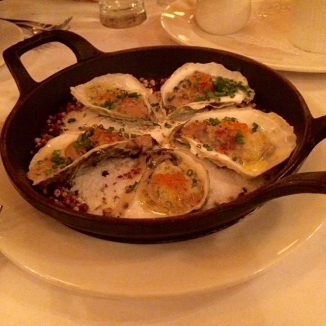The food is what you'd expect from the people who run Balthazar: luxuriously old-fashioned French fare, beautifully executed. You might want to start with those oysters, baked in salt with Pernod butter and little bits of smoked roe. Or this lovely cheese souffle