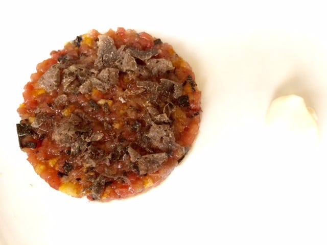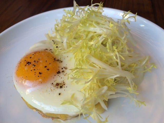 Lemon scented potato tart with truffled egg and frisee. An exciting little lunch. Made even more so by the presence of Steven Spielberg at a nearby table.