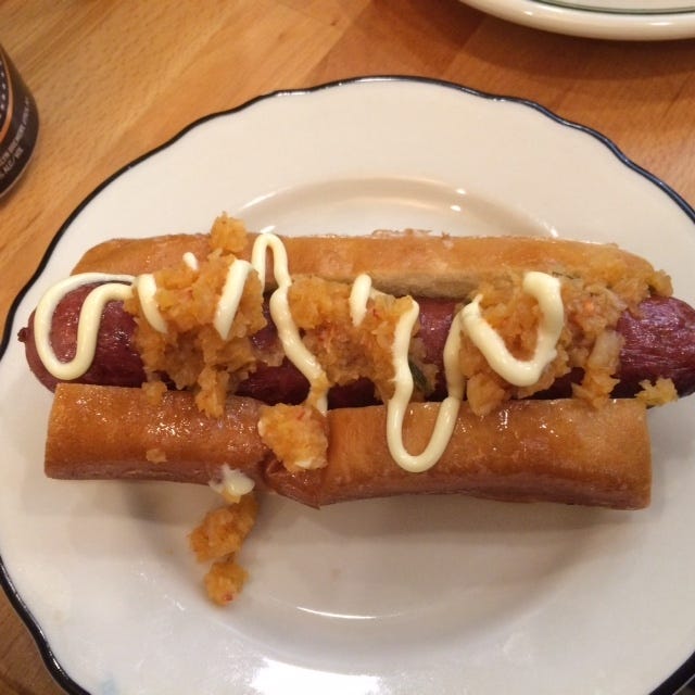 and a kimchi hot dog. Great fun sitting there, watching people struggle in the door.