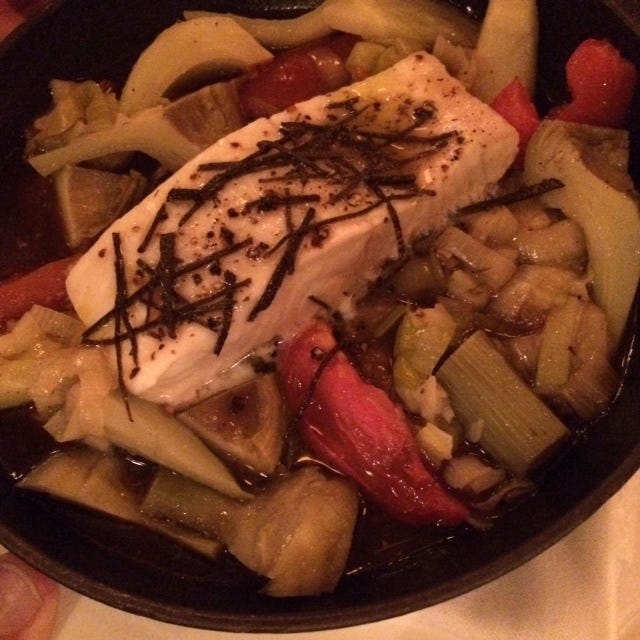 and sea bass in a flurry of vegetables.