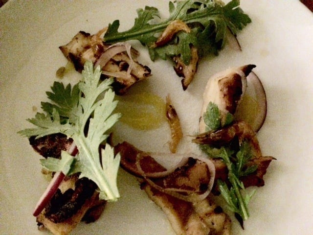 The most wonderful squid, the flavor underlined by a devilish smudge of burnt eggplant puree and the gentleness of maitake mushrooms.