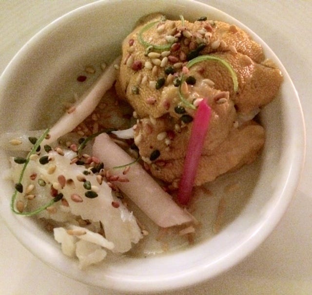 Chawanmushi - but a bracingly clean version - flooded with the voluptuous flavor of crab and sea urchin and sparked by a flash of ginger.