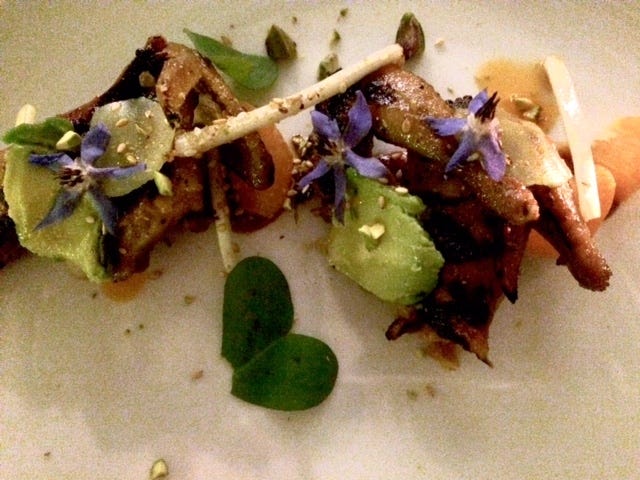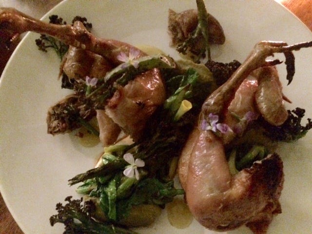 "I want to knock your socks off!" Michael McCarty declared when he opened his restaurant in 1979. I have a special place in my heart for Michael's in Santa Monica: before it made its debut I persuaded my editors at New West Magazine that it was going to revolutionize restaurants. It was, I insisted, brash, exciting and utterly new. I then spent a few days a month for almost a year hanging out with Michael and his chefs as they built the place. It WAS revolutionary: the chefs were all American (unheard of in those days), young (they were all under 25, equally unheard of at the time), and college educated. On top of that they were using American ingredients and showcasing American wines. There were other innovations: Michael was one of the first restaurateurs to computerize his kitchen. He filled the dining room with great modern art (still there), and dressed his waiters in Ralph Lauren. He created a garden so lovely that eating among the plants was reason enough to entice many people through the door. But the food was the main draw. Michael had an eye for talent: the first chefs - Ken Frank, Jonathan Waxman, and Mark Peel- all went on to distinguished careers. I've been back many times over the years, but my last visit left me with a sinking feeling. Nearing forty, the place felt like a tired old star limping along on its last legs. So I was thrilled to walk in a few nights ago and find the place packed to the rafters and filled with energy. I was even happier to look at the menu and find that I was eager to taste every single dish. This is the old age we all yearn for: the rooms have been spruced up, but the basic bones are so good they don't need a face lift. As for the garden - it has only grown more graceful over time. The energy comes from the new chef, Miles Thompson (he worked at Animal, opened Allumette and then went north to work at Shed). His menu is pure fun. Consider that barbecued quail up above, the flavors amped up with tangerine, miso and plum vinegar. Plain delicious.