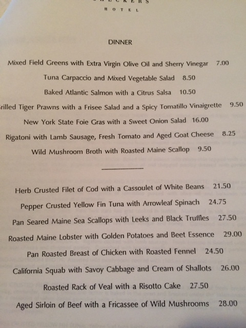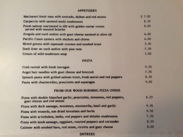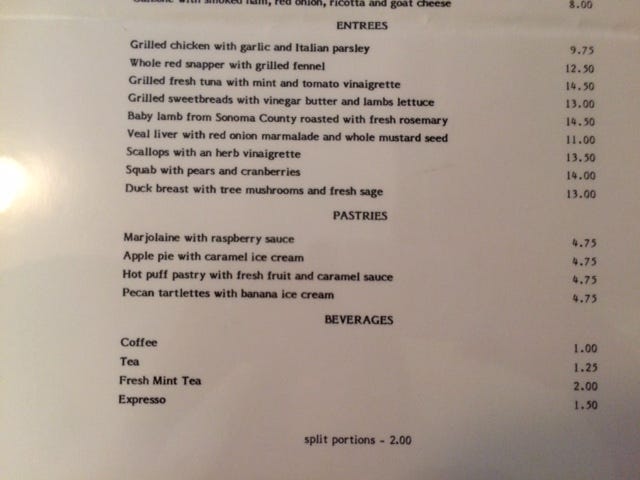 Isn't it interesting that there are two liver dishes, along with sweetbreads and squab? Also note the inclusion of goat cheese, which was then a new American product; Laura Chenel started selling America's first fresh goat cheese in 1979