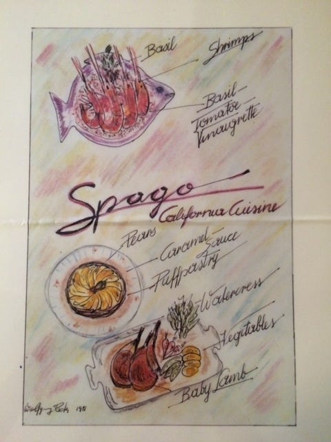 Just found a folder of menus from my years at the Los Angeles Times. There's this one, from the old Spago (Wolf actually drew the cover himself), long before it moved to spiffy new quarters in Beverly Hills. This may be the first menu, although I'm not sure about that. Note that the highest priced entree is $14.50.