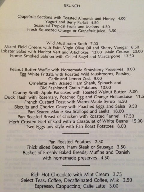 Then there are these menus from Thomas Keller, long before he went on to French Laundry fame. I was a big fan of his food at Checkers Hotel in downtown Los Angeles, but the restaurant never really took off. One interesting note: look how much more adventurous Keller let himself be with brunch. Duck hash; chorizo gravy; peanut butter waffles.