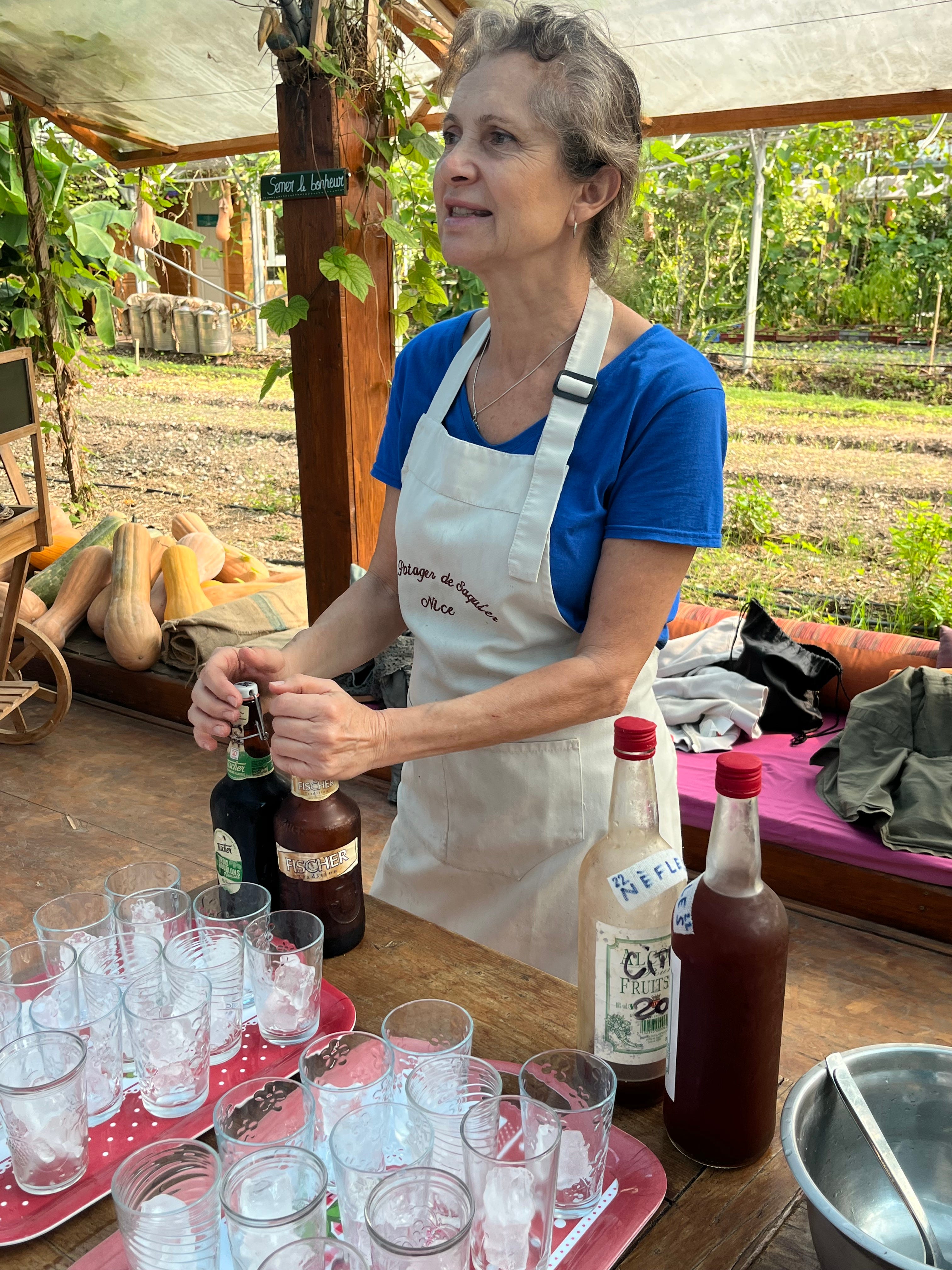So nothing could have made me happier than to begin our sojourn at Le Potager de Saquier, a remarkable biodynamic farm perched on a verdant hillside outside of town. Pierre and Anne Magnani raise a vast array of fruits, herbs and vegetables (which they sell on Saturday in the market in Nice), and offer occasional rustic meals on an extremely charming terrace to a few lucky people. You can even stay there, in one of their funky (and inexpensive) rooms.