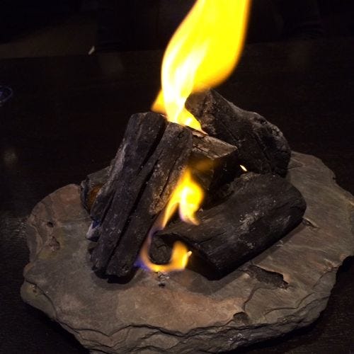 Charcoal? Yes and no. Hidden in that pile of binchotan is a cube of wagyu beef and another imposter, a rectangle of parsnip. Rescued from the fire, the charred lumps are carved, at the table, to reveal a heart of red in one, a pristine white interior in the other. Pure delight.