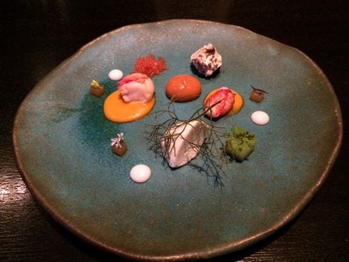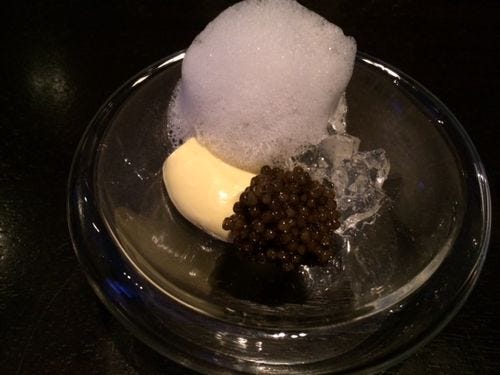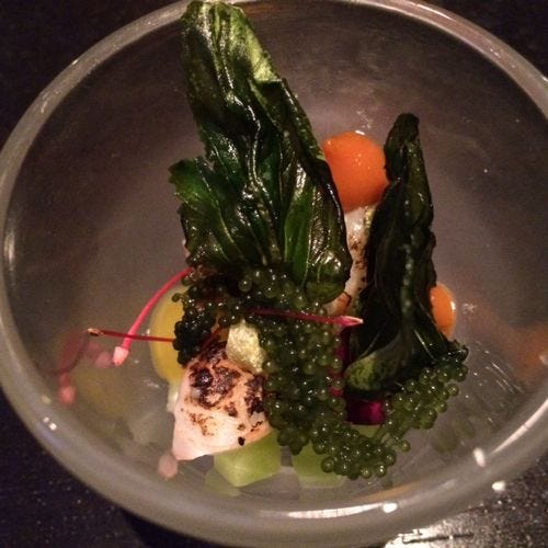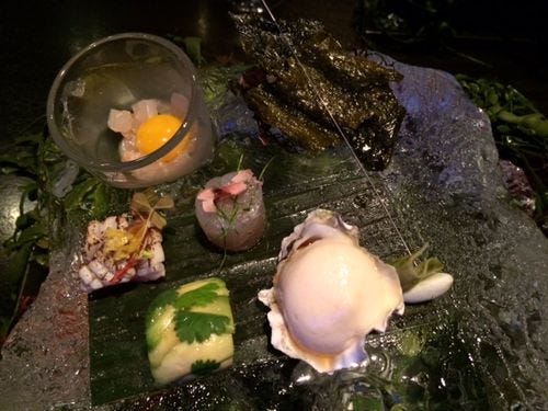Who could resist this huge block of seaweed-draped ice, which arrived singing gently, murmuring of the sea (there was dry ice beneath the ice). On top, delicate little bites of sushi – abalone wrapped with green almond, ahi with avocado, kampachi mixed with quail egg yolk to spoon on crisp kombu crackers. A tiny oyster. A little bite of green almond, with its surprising softness.