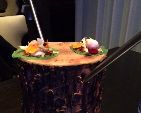 Over the top? Silly? Definitely. Inside that log with the metal straws was a cold nasturtium soup: its rather austerely prickly flavor seemed like a contradiction, the opposite of its presentation. On top, a tiny little bite of frog's leg to wrap up with more nasturtium. The tiny tangle of flavors reminded me of nothing so much as the Thai appetizer, miang kam. It was especially lovely with the S.A. Prum 2009 Riesling, all sweetness edged with acidity