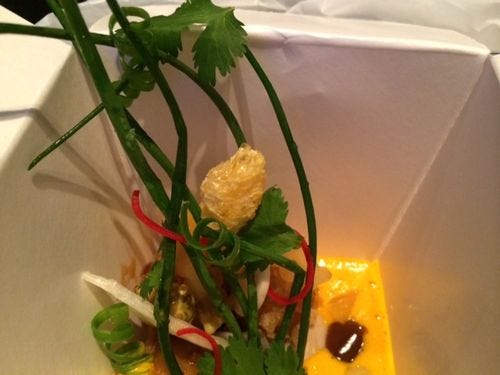 .Now we're in China – sort of. A little take-out box containg tiny bits of fried sweetbread with ginko nuts in an orange sauce. The fun here? Eating it with "chopsticks" made of two long cinnamon sticks.