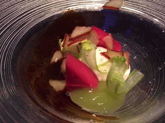 All night a branch of rhubarb has been circling just above our heads, suspended from the ceiling on an almost invisible wire, twirling silently. Now it is cut down, and we get this lovely little dish…. crisp rhubarb, gentle celery, and tying them together, an almost invisible slick of licorice that makes this more salad than dessert. With it, the loveliest candy-pink rosé from Arnot-Roberts in Clear Lake.