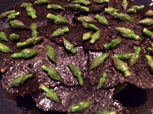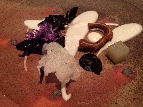 A tiny bite. An edible pun. Wood ear and pig ear, with a frisk of cracker, a squish of black garlic puree, some garlic blossoms. The joke here is that the pig ear is, by far, the most delicious morsel on the plate.