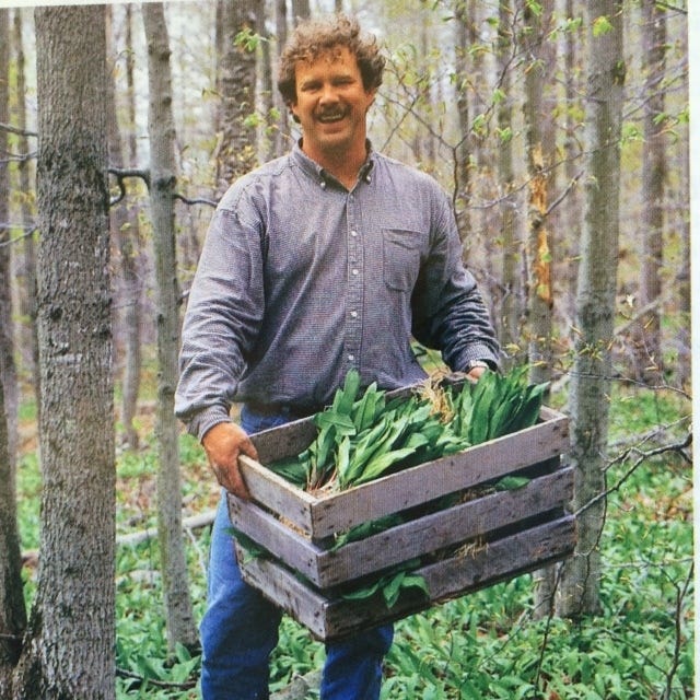 That's Rick Bishop of Mountain Sweet Berry Farm sixteen years ago, and if you're wondering who's responsible for the ramp mania that's swept the country over the past few years, he's a good candidate. This photograph is from the April 2000 issue of Gourmet; Food Editor Kemp Minifie bought some ramps from Rick at the Union Square Farmer's Market, and we were all so excited about them that we decided to investigate Rick's ramps.