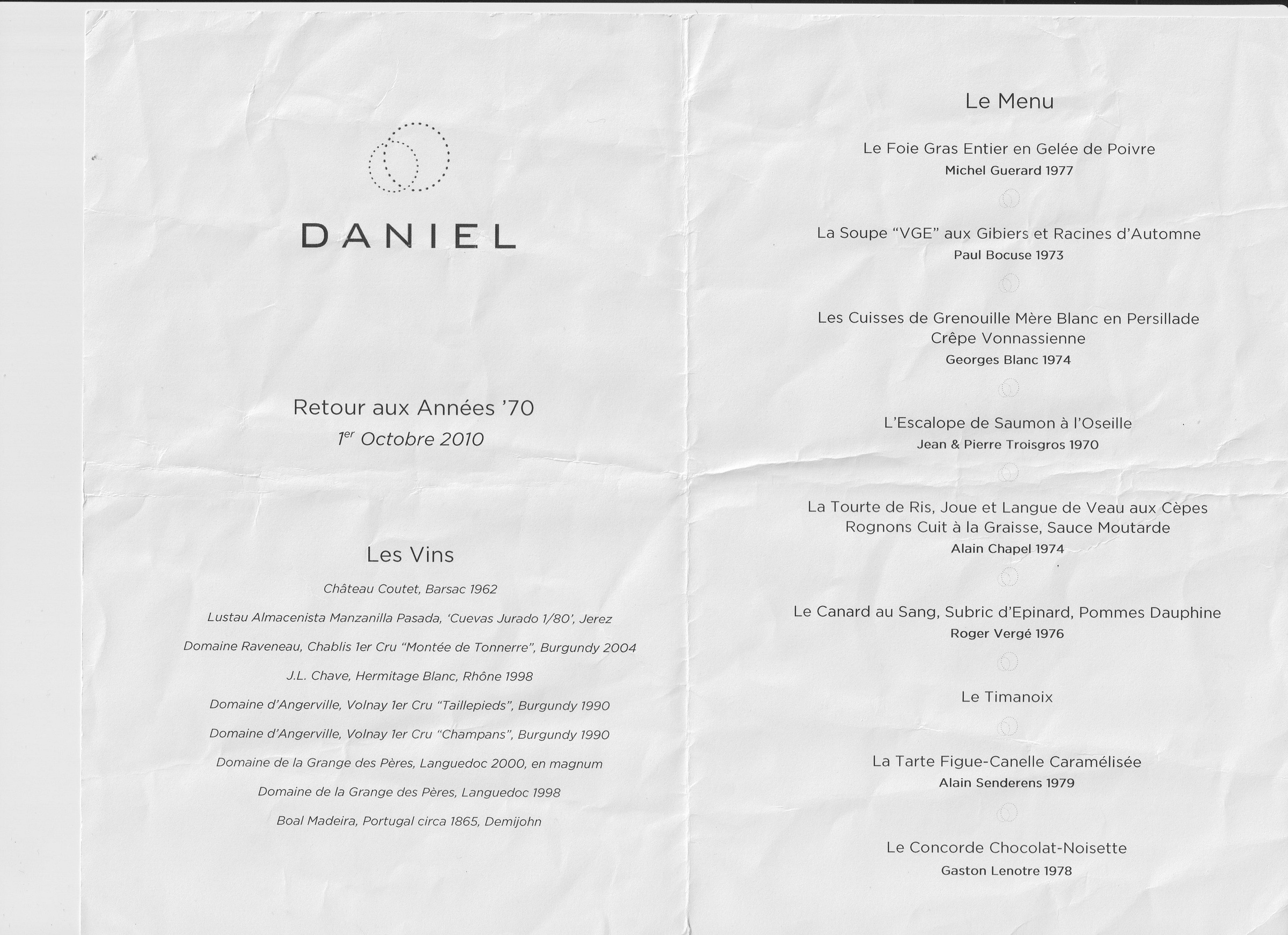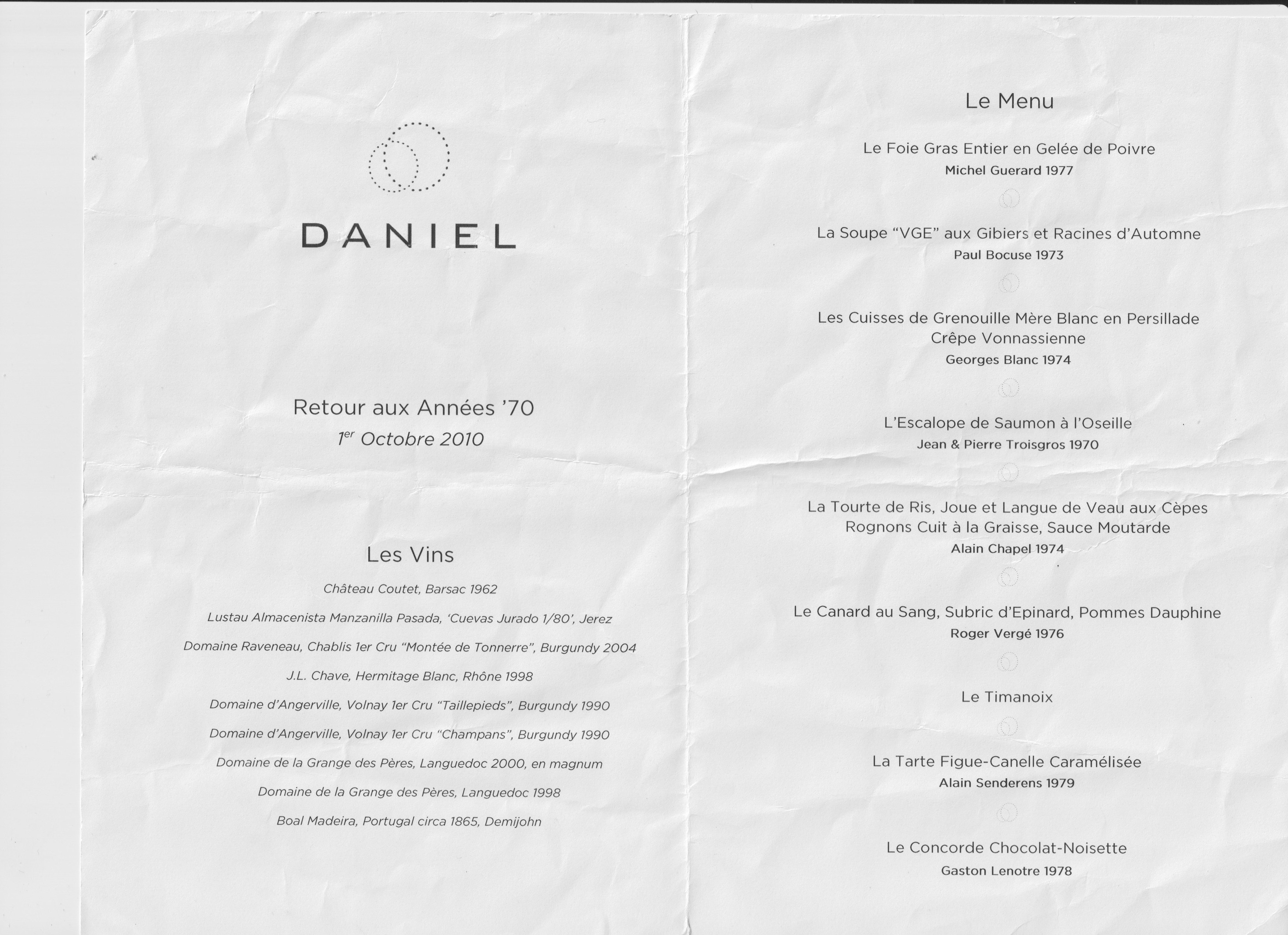 This was a dinner Daniel Boulud threw almost twenty-five years ago to pay homage to the great chefs who created la nouvelle cuisine.