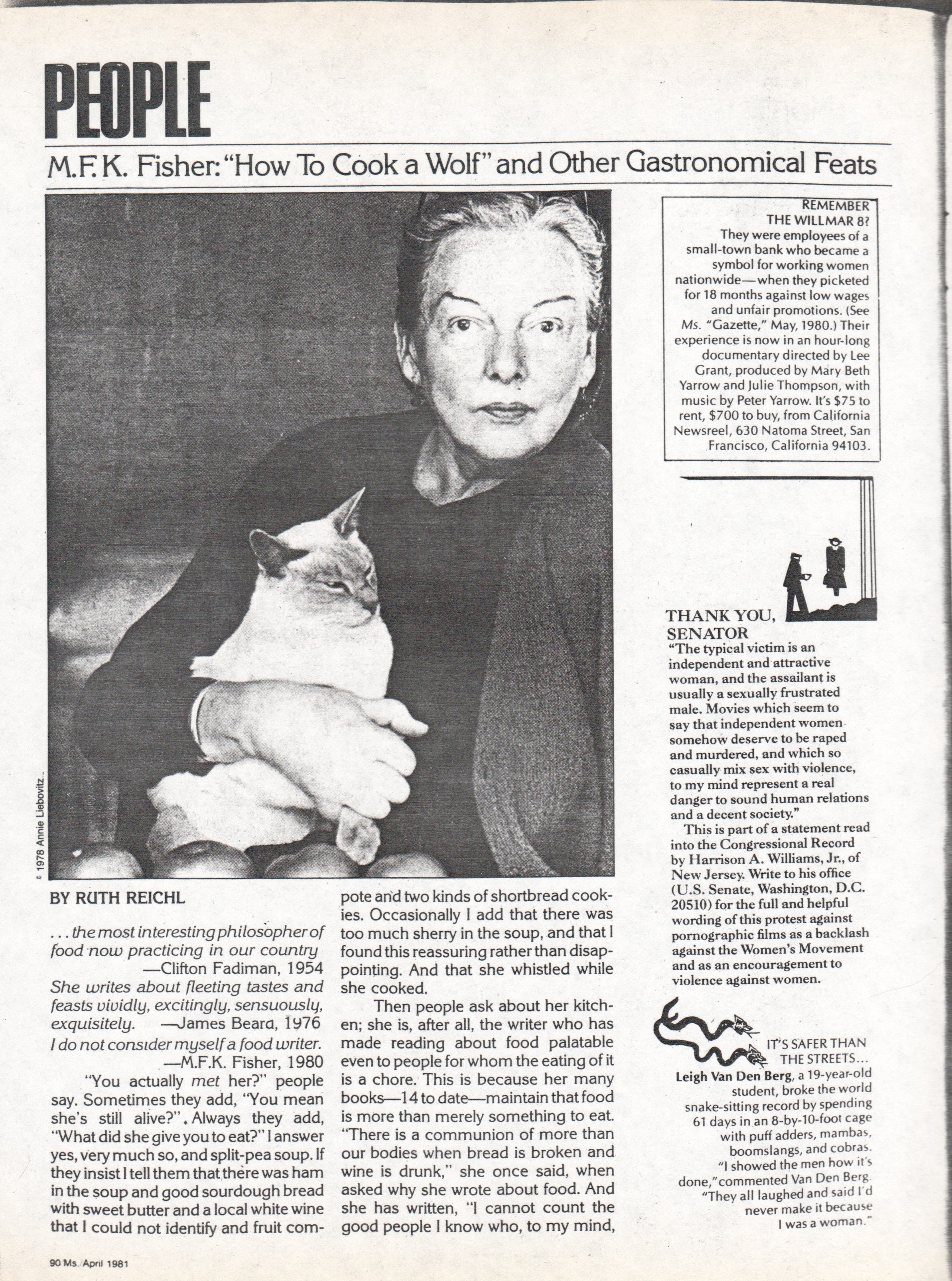 It's hard to believe, but I clearly remember reading this piece in 1981. I thought the Annie Liebovitz photo was stunning, and then the writing itself drew me in. I had never heard of MFK Fisher, so I was doubly intrigued. At the time, I was in the Navy, living overseas, and when my Ms magazine landed in the communal mailbox, I remember people looking at me as if I were 1) more avant garde and 2) weirder than they already imagined. LOL.