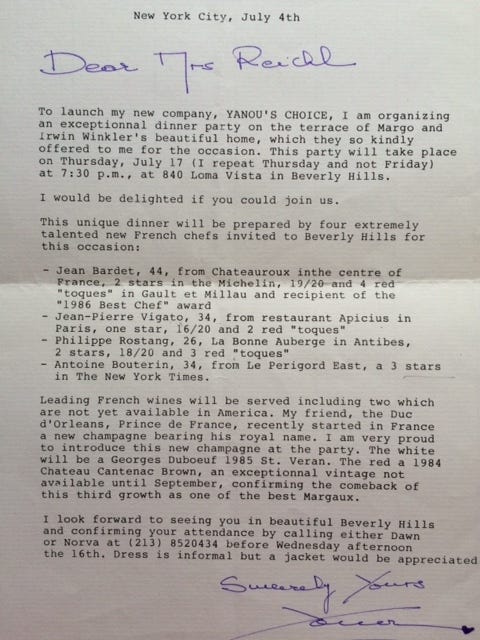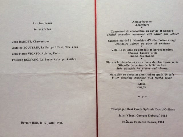 Yanou Collart was an original, a strange amalgam of publicity agent, talent-seeker in the world of food, party girl and collector of rich people. She seemed to know everyone in Paris, and I've never met anyone quite like her. This meal, in a fabulous Hollywood home, was memorable; the guest list glittered, and every single one of the chefs was a major talent.