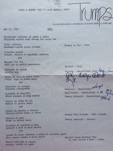 There's a lot to study here. For one thing, tapas were almost unknown in this country in the eighties, so the idea that Trumps' late chef, Michael Roberts, was creating them was ground breaking. (Also, they're fairly classic, which was strange for Michael; he was a chef with a great sense of humor and an iconoclastic bent.) Then too, Darrell Corti is one of the great experts on sherry, so this was an opportunity to learn about the fortified Spanish wine. I remember this as a really exciting occasion.