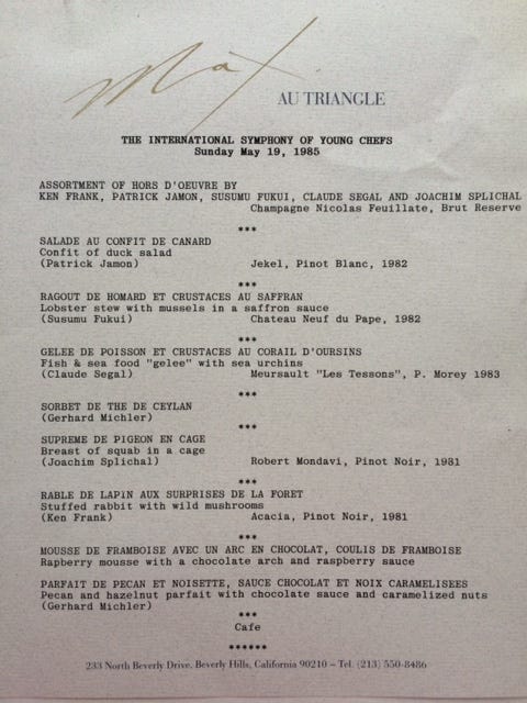 Max Au Triangle was one of the most exciting restaurants to open in Los Angeles in the early eighties. The chef was Joachim Splichal, who had been cooking at The Regency Club before that. After the Beverly Hills restaurant - wildly ambitious - closed Joachim opened Patina. But this special meal took place while Max au Triangle was still in its glory.