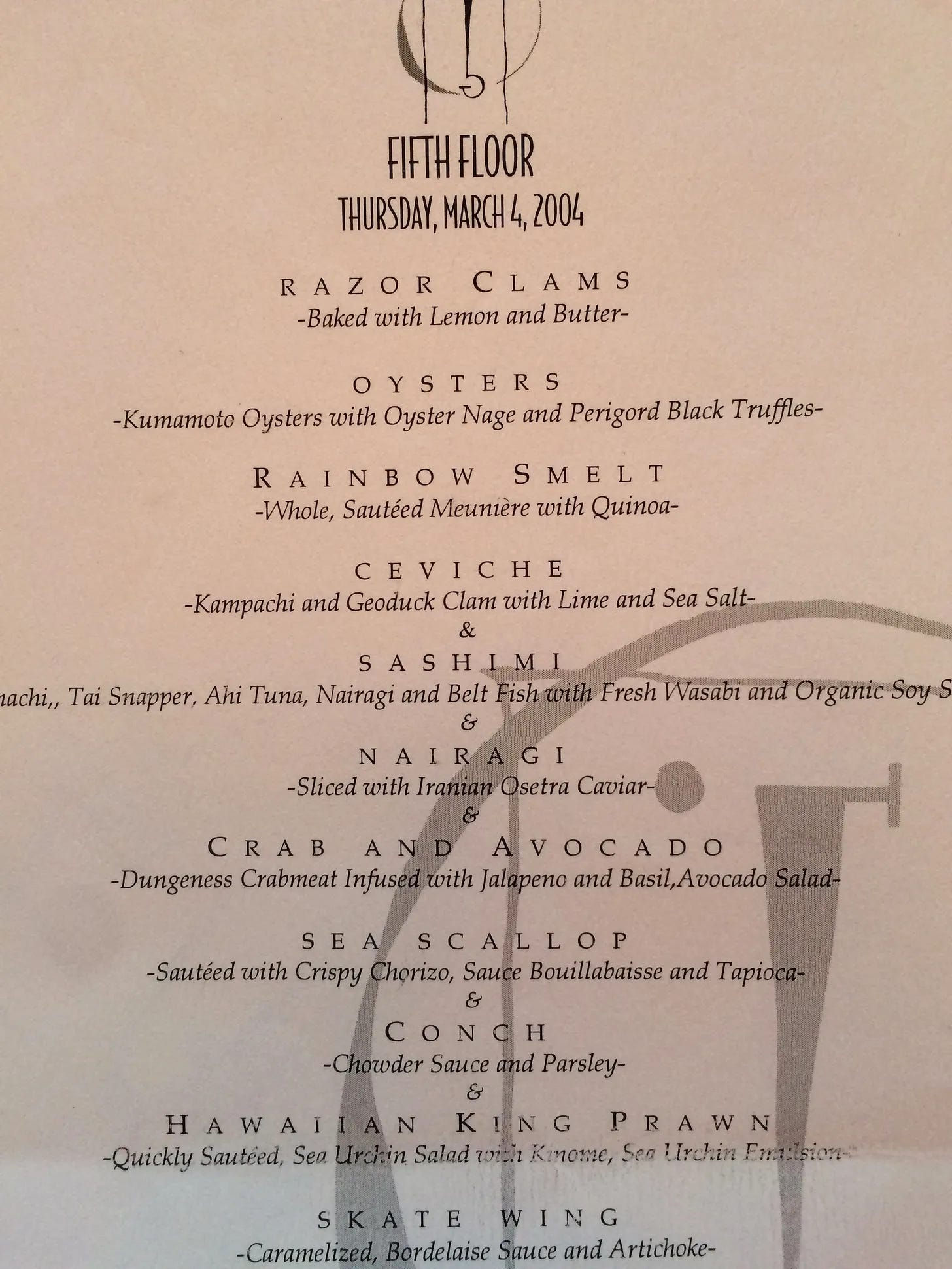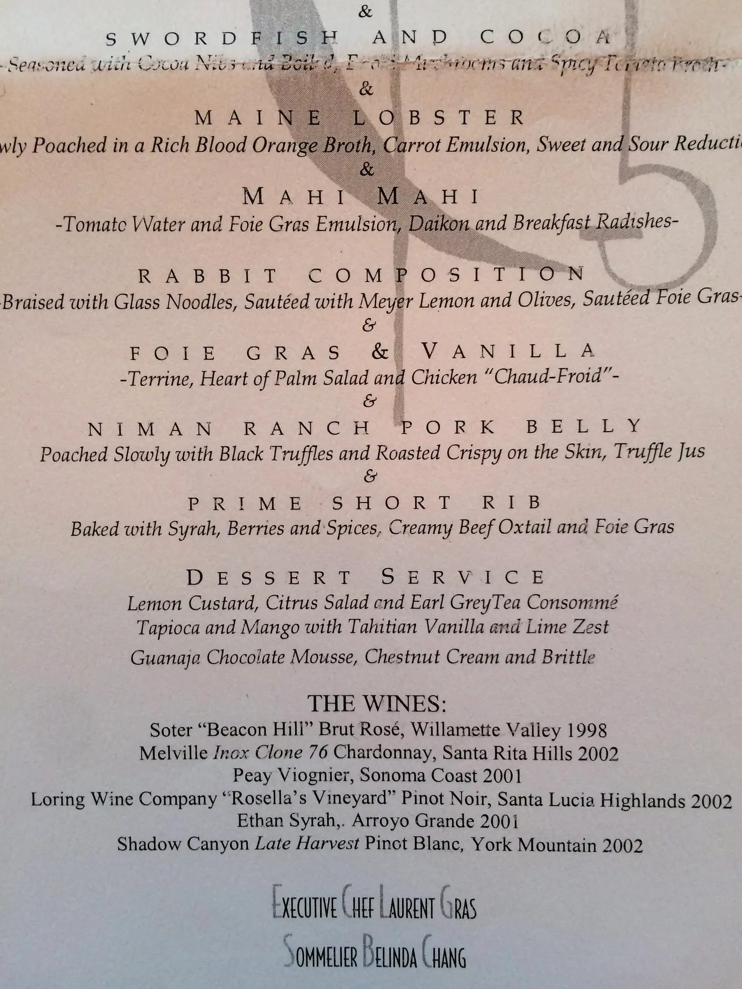 This menu, from Fifth Floor, is an example of how ambitious his cooking can be. But I remember not only the meal, but also the wonderful wine pairings by sommelier Belinda Chang.