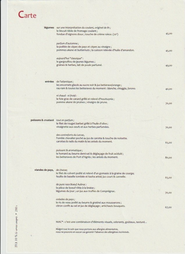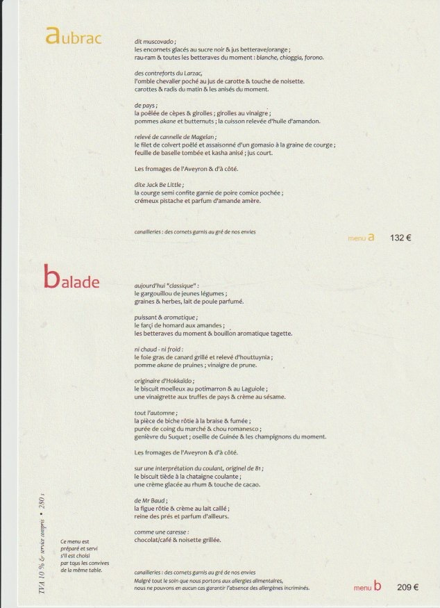 Much of the Alice B. Toklas cookbook takes place in remote French country towns. In honor of that I offer up this old menu (I think it is from 2014), from the legendary three-Michelin star Maison Bras.