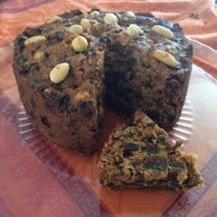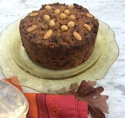 This year's Gift Guide will begin right after Thanksgiving, but if you want to order this superb fruitcake, it might be a good idea to do it now. The cakes - the small one weighs in at two and three quarters pounds - are made to order from organic ingredients, and even people who hate fruitcake like this one. Full disclosure: Robin McKay, the fantastic fruitcake baker, tested all the recipes for My Kitchen Year, so I'm not exactly unprejudiced. She's a wonderful cook, a great baker - and these fruitcakes are really special. I just sent off my order for a few friends, and it occurred to me that I might mention it to you. And now I have. Details: the fruitcake is made in small batches with organic currants, flame raisins, sultanas, figs, dates, apricots, candied orange, lemon peel, almonds, and hazelnuts. The ingredients are organic and locally sourced: even the eggs come from the coop next door. The flour is organic, the ginger is fresh, the butter cultured. Brown sugar, baking powder, powdered ginger, nutmeg, and sea salt are all organic. The Germain-Robin Craft brandy is made in small batches, but it is not organic. Well-wrapped, the cakes last a couple of months. But they won't.