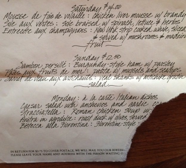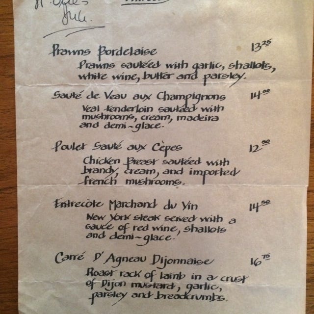 I've been going through old papers, coming up with fascinating vintage artifacts. Yesterday I happened upon these three old menus from my days as restaurant critic at New West Magazine.