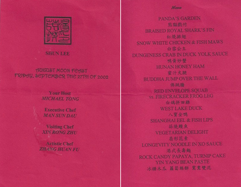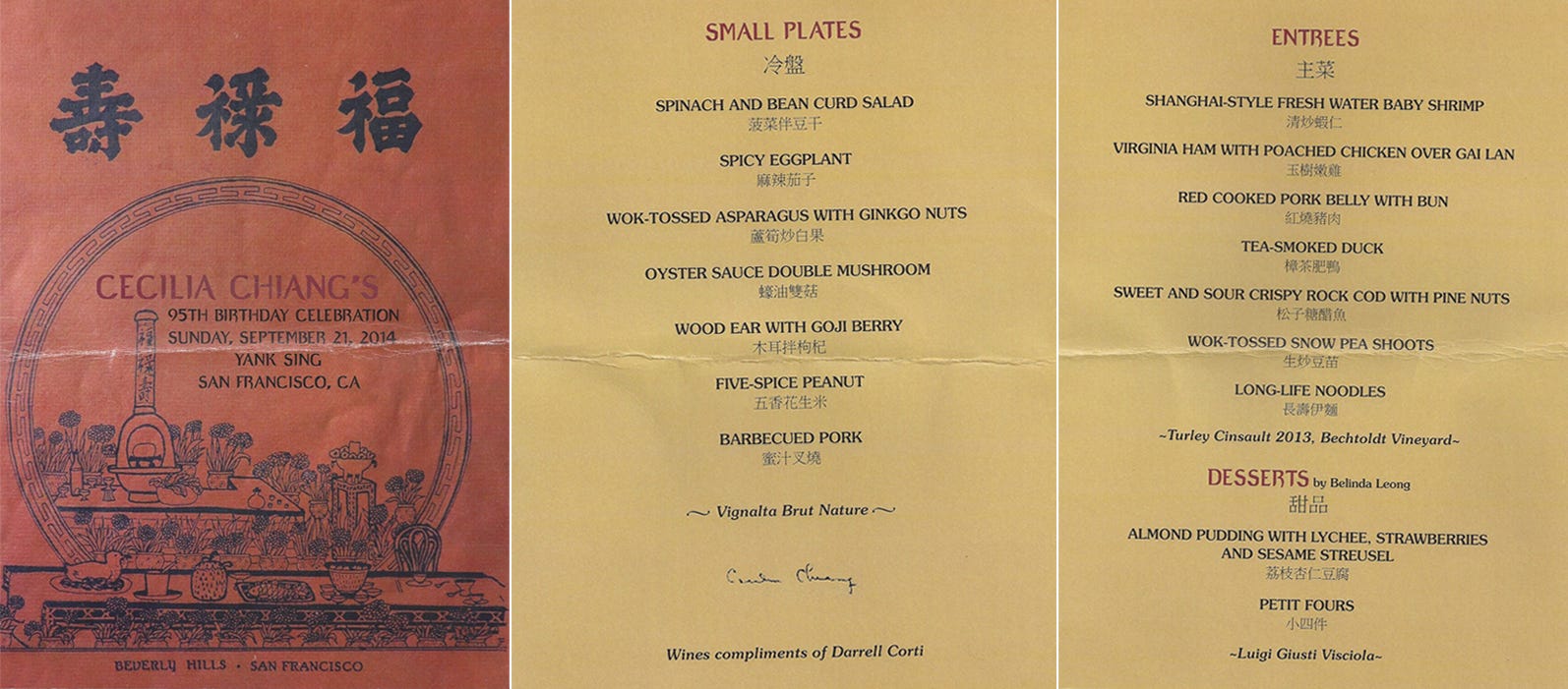 And then another menu celebrating the wonderful Cecilia Chiang. This was the menu for her 95th birthday party at San Francisco’s Yank Sing restaurant.