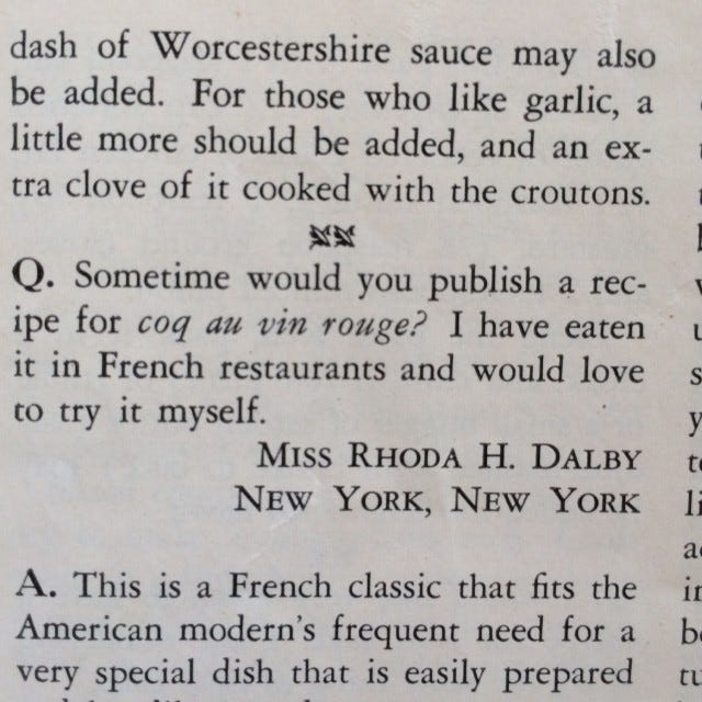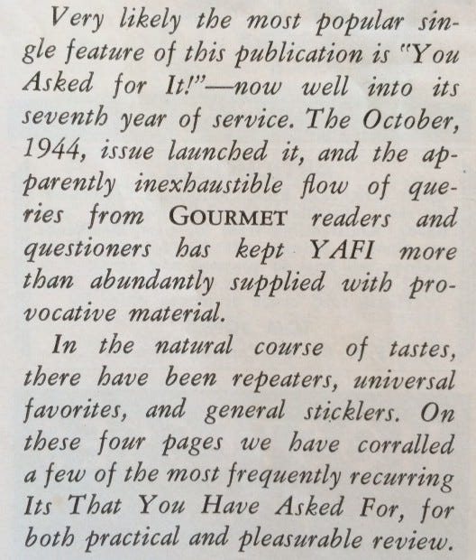 It's January 1951 at Gourmet, and the editors are celebrating the magazine's tenth anniversary by reprinting their most frequent requests. The article offers a few fascinating - and often surprising - insights into what America was eating in the middle of the last century. The recipes literally span the globe. Here are a few that most intrigued me. (Others include Shrimp Creole, Coq au Vin, Chopped Chicken Livers, Onion Soup, Salt Rising Bread and that most ubiquitous of recipes, Lindy's Strawberry Cheesecake.)